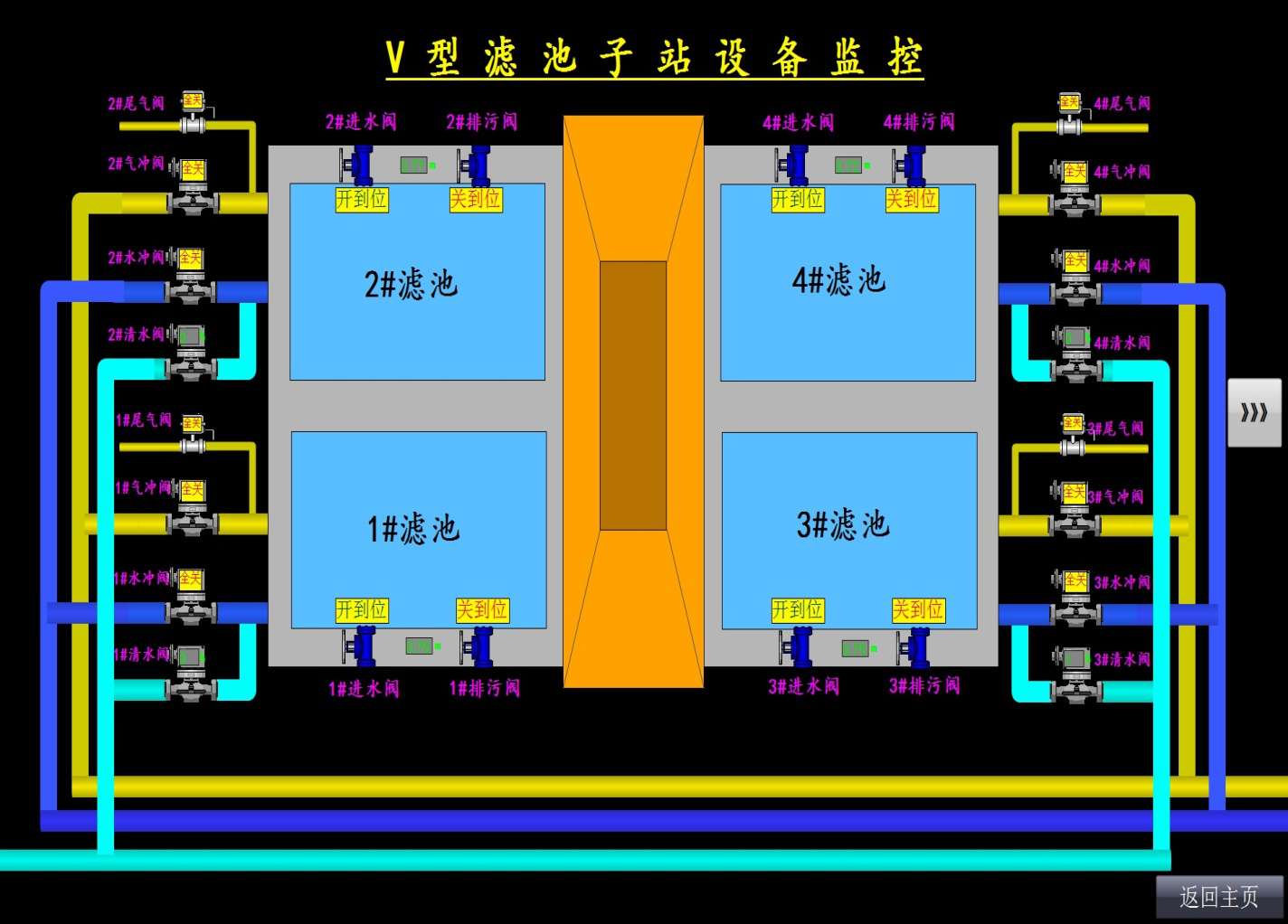 在水廠水處理工藝中,濾池對水的凈化起到關鍵作用。V型濾池由于具有出水水質好、濾速高、濾水周期長、反沖洗效果好和便于自動化管理等特點,因而在國內得到了廣泛應用。但大量實踐也表明,V型濾池對工藝設計、施工精度和管理水平要求甚嚴,任何環節出現疏忽,都會影響其運行效果。V型濾池過濾和再生的自動控制是濾池正常生產運行的保障。英波水務設計的閥門自動控制系統采用了可編程序控制器和工業電腦(PLC+IPC)組成的實時多任務集散型控制系統,對濾池的過濾和反沖洗實行自動控制。
