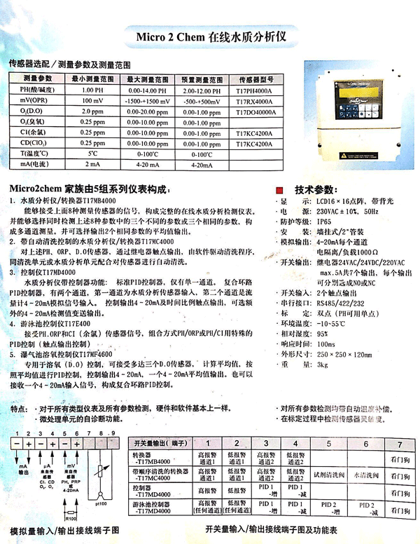 能接受余氯、二氧化氯、PH/ORP等多種傳感器信號,同T17KC4400傳感器構成余氯/二氧化氯在線檢測儀表,可同時選擇檢測三個相同或不同的參數,并可選擇2個相同參數的平均值輸出。
